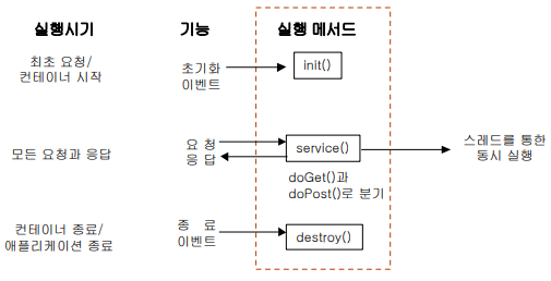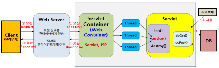 init() 메서드는 최초에 한번만 수행되고 이후 요청은 스레드로 실행되며 각각 service() 메서드를 통해 doGet()이나 doPost()로 분기된다. 이때 HttpServletRequest와 HttpServletResponse를 매개변수로 전달한다.