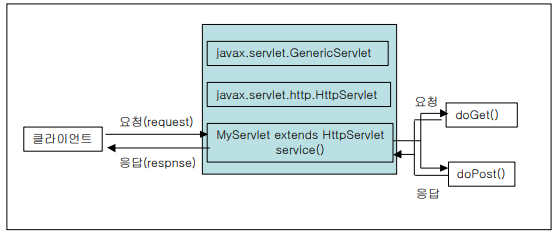 클라이언트 요청을 처리하고 그 결과를 다시 클라이언트에게 전송하는 Servlet 클래스의 구현 규칙을 지킨 자바 프로그램이다.